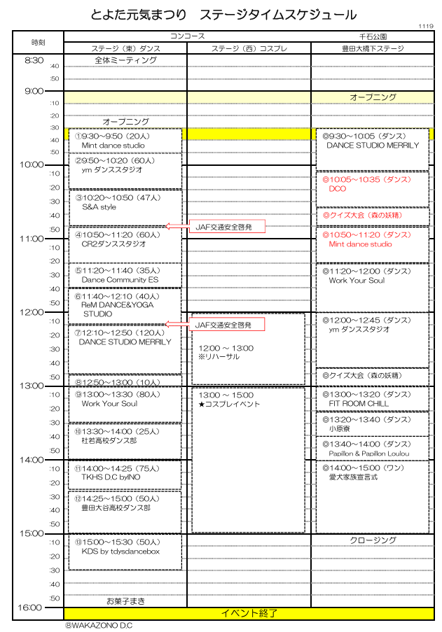 主催者側から、タイスケ、入場料の連絡を頂き、会場図、駐車場などはまだ連絡が来ていない状況です。連絡があり次第改めてご連絡致します。
