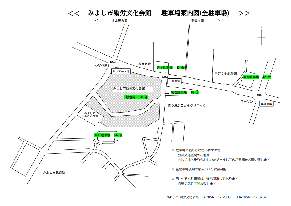 会場の駐車場は、施設内と駐車場第1~第4の合計622台が駐車可能です。