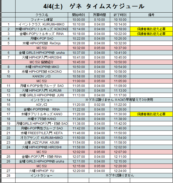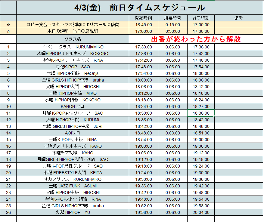 - 出演クラスの場当たりが終わり次第、順次解散となります。