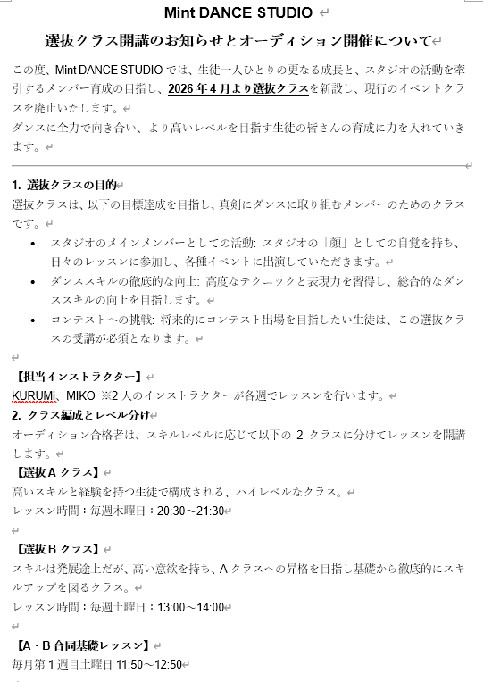 📢 Mint DANCE STUDIO 新章突入!選抜クラス始動&オーディション開催決定!